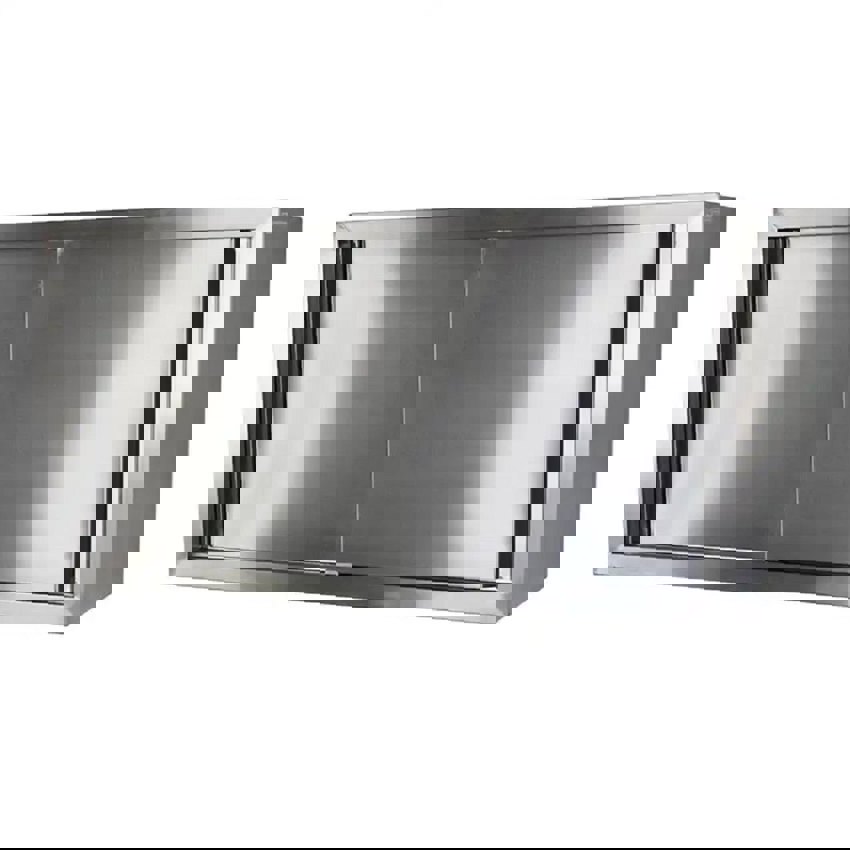 Hotel wall-mounted cabinet made of stainless steel. Features 2 internal partitions. Inside dimensions: 580mm height, 330mm depth, 1197mm width. Weighs 20.0 kg.