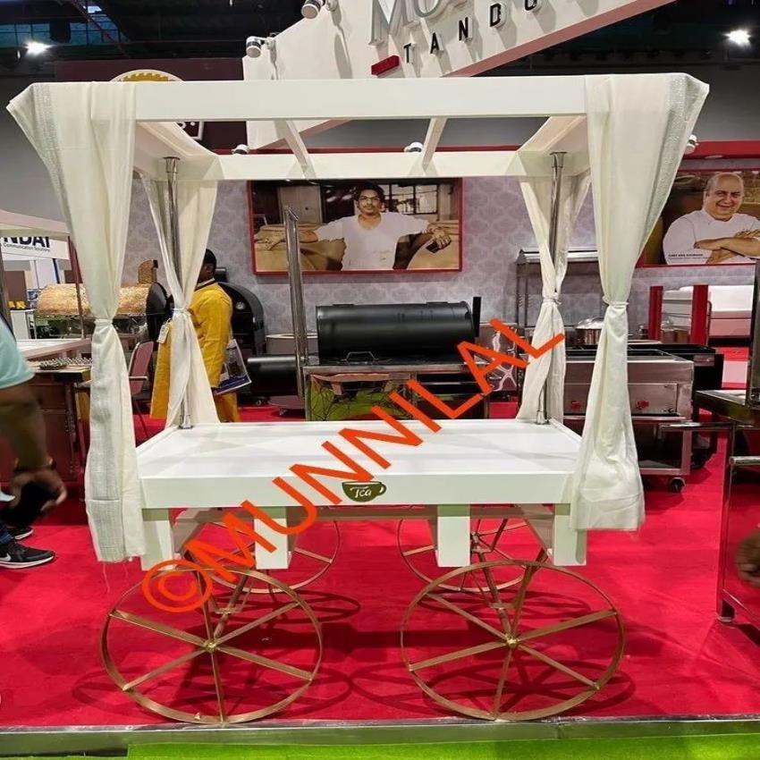 White stainless steel food cart with 100 kg load capacity. Features an open roof, paint-coated finish, and 4 wheels. Weighs 45 Kg.