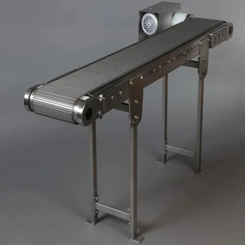 Semi-automatic stainless steel wire mesh conveyor, 304 grade. Handles 1-50 kg/feet, operates at 5 m/minute up to 1000°C. Ideal for annealing, baking, and drying applications.