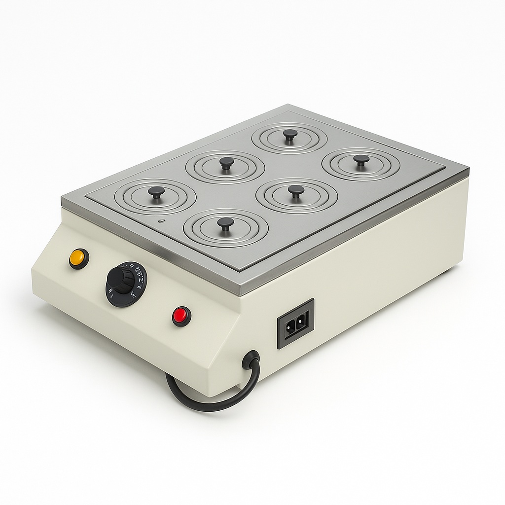 SSE model stainless steel water bath. Operates from ambient to 100°C. Available in 6 or 12 hole capacity for laboratory use. Made in India.