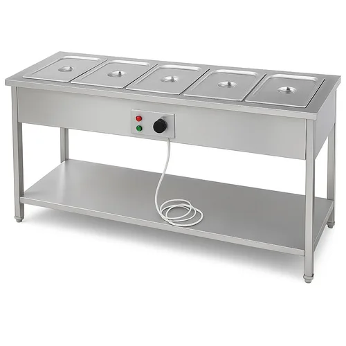 This standing bain marie features a half-covered design and 20-liter capacity per container. Made from SS 202 material with 2kW electric input power.