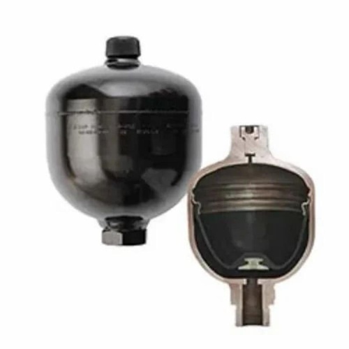 Steel diaphragm accumulator for oil storage under pressure. Features 250bar maximum pressure, black color, and diaphragm design. Suitable for temperatures up to 80 deg C.