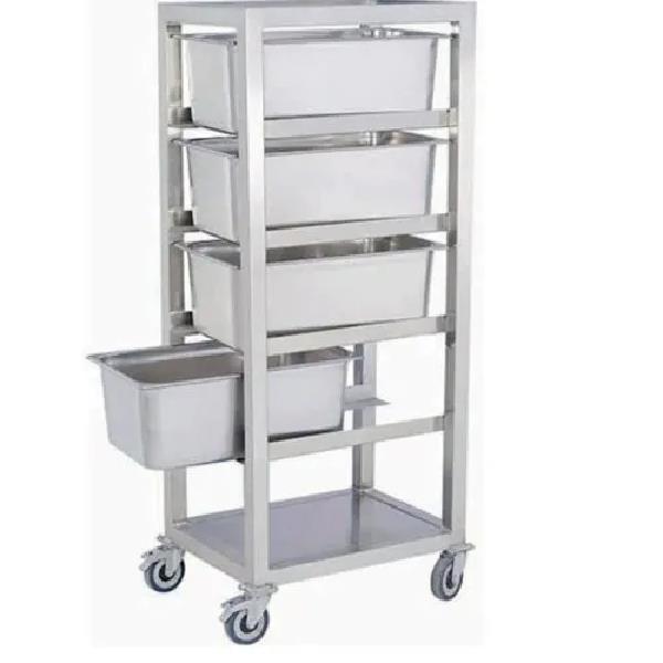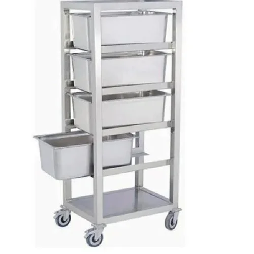 This polished stainless steel food trolley features 5 shelves and 4 wheels for manual operation. Constructed from SS304 grade steel, it offers a 20-30 Kg capacity.