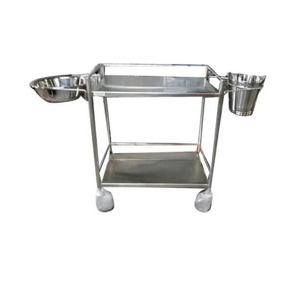 Polished stainless steel (SS304) catering trolley with 4 legs and 2 sleeves. Dimensions are 3 x 3 x 2.5 feet, ideal for professional food service operations.