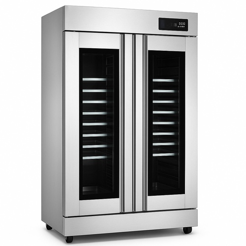 Steel double door proofer machine with 50 Hz frequency and 220V electric power source. Features durable steel body construction for reliable operation in bakeries.