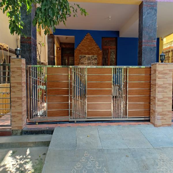 Robust steel gate integrated with FunderMax sheeting. Offers enhanced strength and weather resistance. Ideal for secure property access with a modern finish.