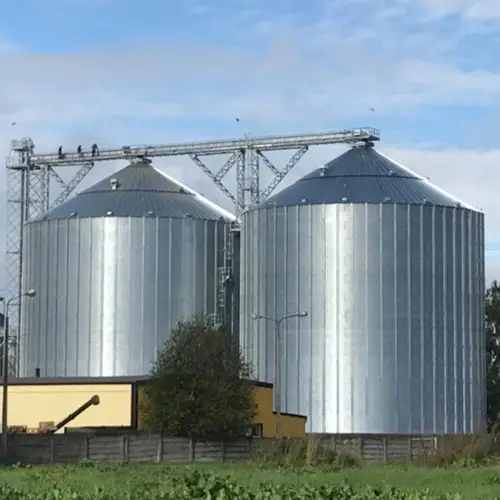 Steel silo for bulk storage of grain, paddy, food products, and sawdust. Capacity from 10 to 10,000 tons, height customizable.