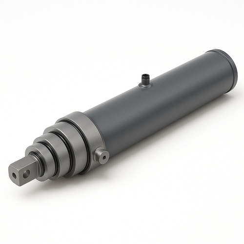 Steel hydraulic telescopic cylinder with a bore diameter up to 25 mm and a maximum stroke of 600 mm. Weights range from 17 to 106 Kg.