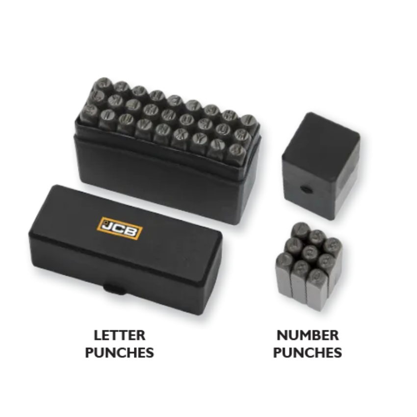 Durable steel letter and number punches for industrial use. Features include 1-5 inch overall length and 50-70 HRC hardness. Packaged in a convenient plastic box for organization and protection.