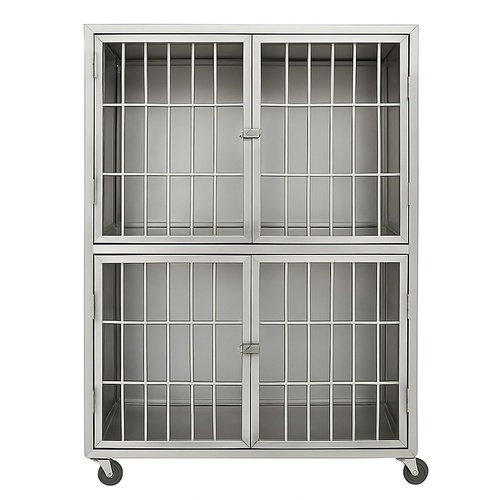 Clinic purpose stainless steel dog cage. Durable and hygienic material ensures safety and easy cleaning for veterinary use. Robust construction for reliable containment.