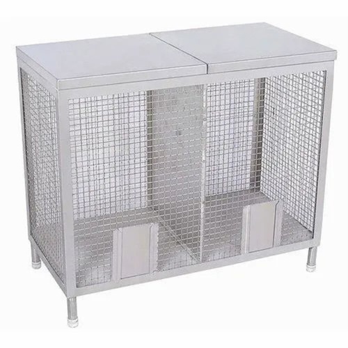 Silver stainless steel kitchen bin with nylon/polymer wheels. Capacity ranges from 30 kg to 150 kg. Durable and easy to move for kitchen operations. Made in India.