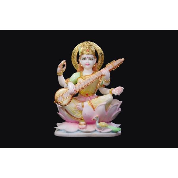 Painted marble Saraswati Maa statue, 36 inches in size. Crafted from stone marble for temple use, this Hindu deity statue is a vibrant addition.