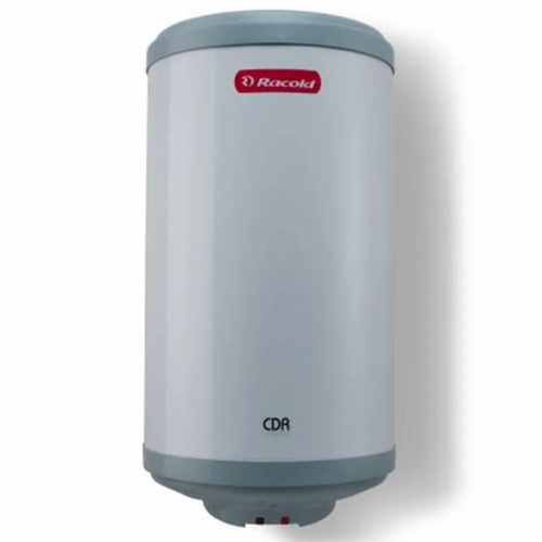 White 15-liter storage electric geyser. Features 2000W power, 8 bar pressure, 230V AC, and ABS plastic body. Made in India.