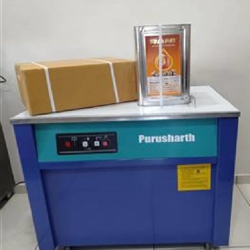 Mild steel strap and bundle packaging machine. Designed for secure bundling of products, ensuring stability during transit and storage. Robust construction for reliable performance.