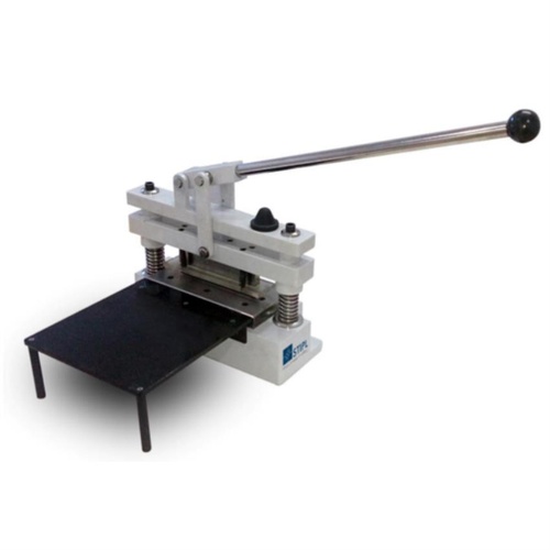 Manual punch and die strip paper sample cutter for the paper industry. Constructed from stainless steel, it offers a production capacity of 5 units.