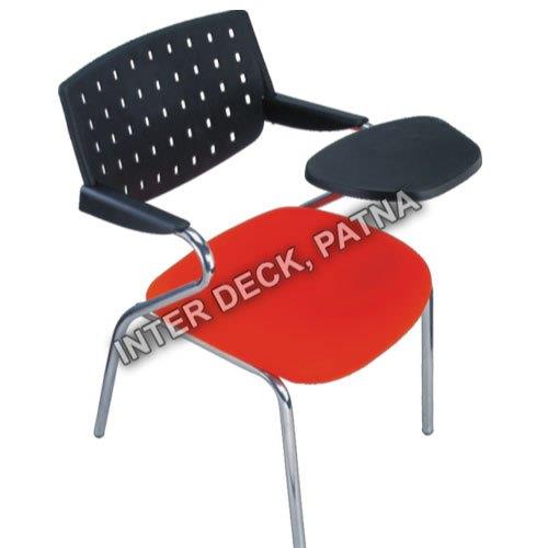 School student chair with plastic seat, fabric cushion, and mild steel frame. Features 4 legs with 1" round chrome-plated pipes. Standard design, suitable for educational institutions.