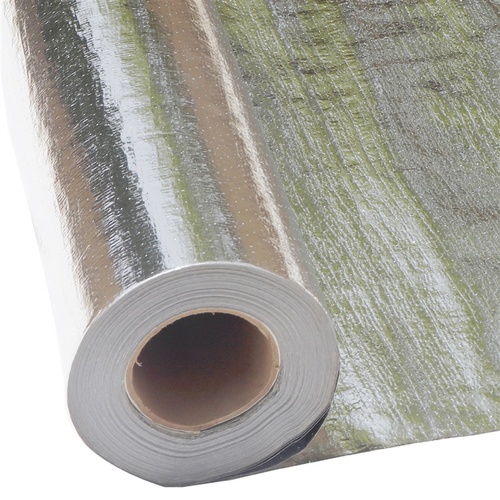 Perforated breathable radiant barrier, 4ft x 125ft (500 sq ft). Reflects 97% radiant heat. Tear/puncture proof. Inhibits condensation. Class A/1 fire rating. ISO 9001 certified.
