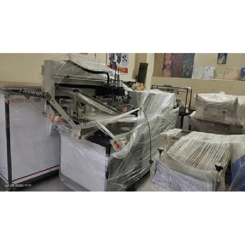 Semi-automatic Ribbon Screen Printing Machine for fabric. Prints multi-color with a speed of 1200 imp/hr. Features 1 HP single-phase power and wooden packaging.