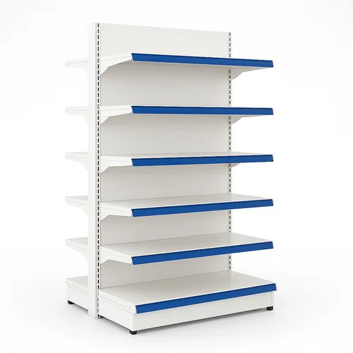 White mild steel rectangular end cap shelves for supermarkets. Powder-coated surface finish with 300 mm depth. Provides open storage for retail products.