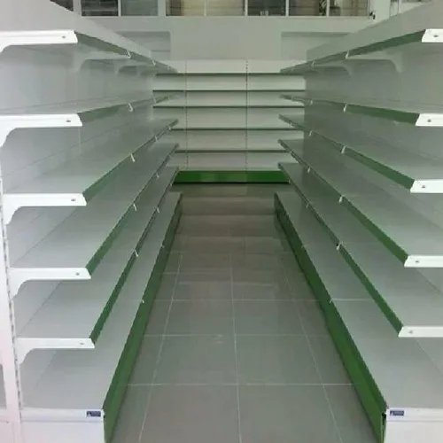 Free-standing mild steel supermarket shelf rack. 6 shelves, 7ft height, 3ft length, 18-inch depth. Load capacity 80 kg per layer. Made in India.