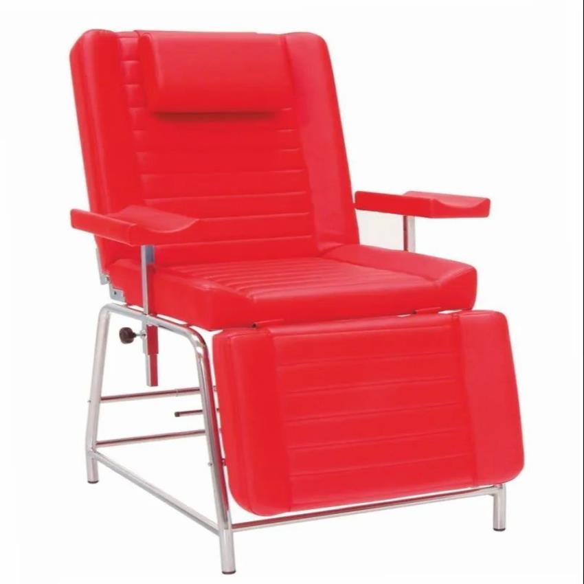 Manual, foldable blood donor chair. Features adjustable seat, stainless steel construction, and non-rotatable design. Red color, made in India.