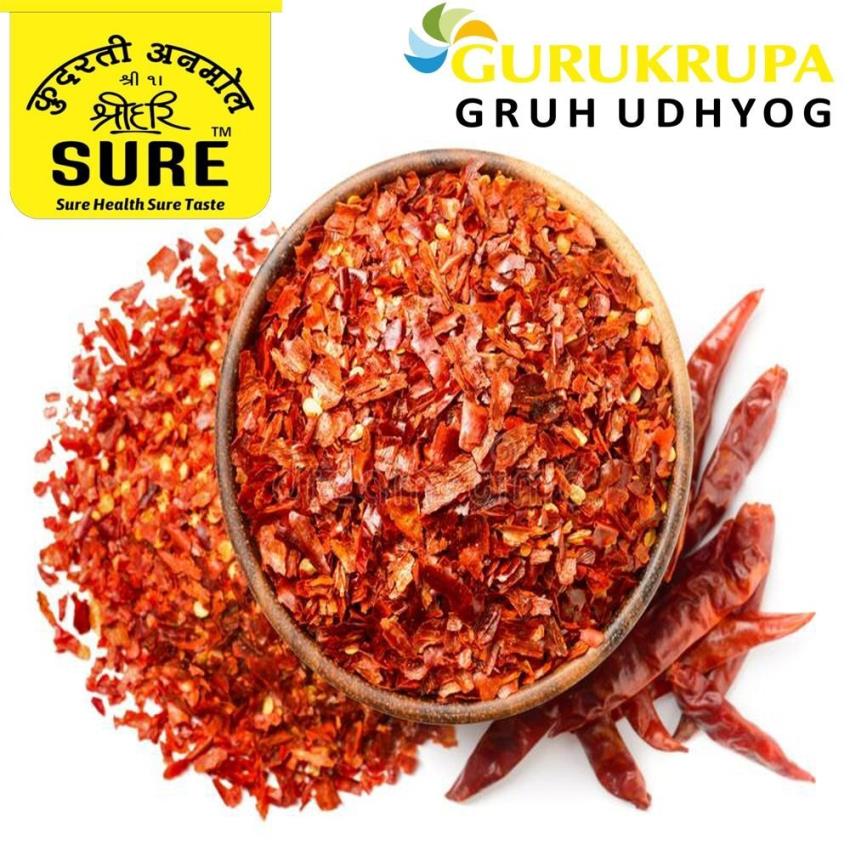 A Grade Red Chilli Flakes, FSSAI Certified. Loose packaging, 12-month shelf life. Store in a cool, dry place. No preservatives added. Minimum order 25 Kg.