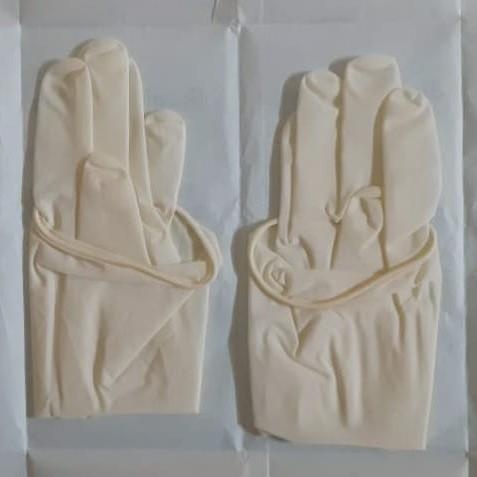 Milky white, latex rubber surgical gloves. Model RG0723. Designed for sterile surgical procedures, offering reliable protection and comfort.