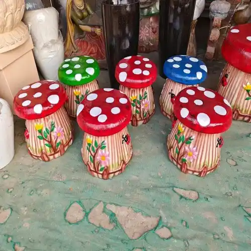 Mushroom-shaped FRP stool, 15" x 15", 15" height. Available in various colors. Non-foldable. Weighs 5 Kg. Suitable for home, cafe, restaurant, office, and school. 2-year warranty.