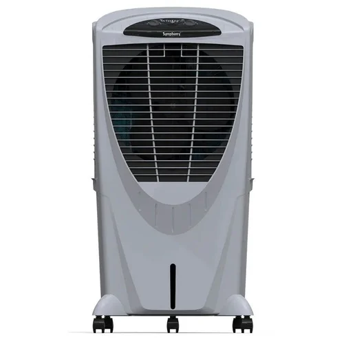 Powerful Symphony 80L desert air cooler made of plastic. Features 165W power consumption and an 80-liter tank capacity, providing air throw up to 25 ft.