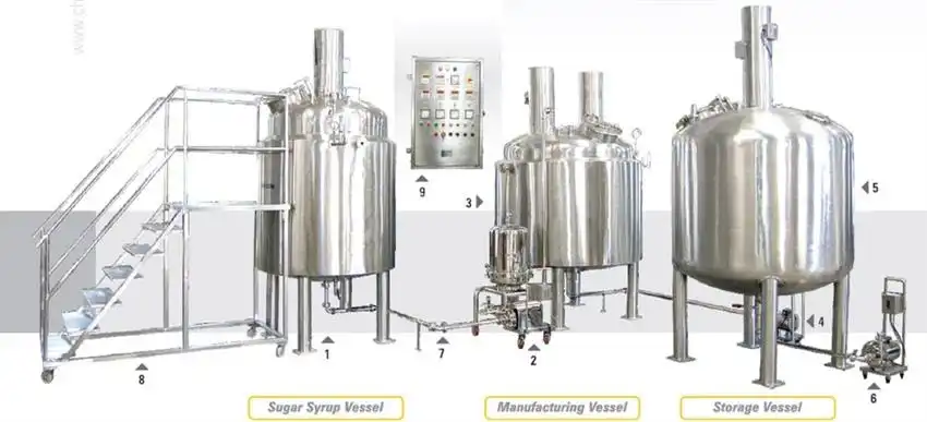Automatic electric syrup making machine for the phara industry. Made of SS 316, 500-15000 kg/hr capacity, 220-380V, 50-60Hz, three-phase power.