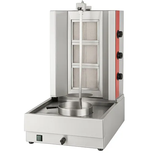 Silver stainless steel table-top gas shawarma machine. Features 2/3 burners and automatic rotation. Designed for commercial use with 20kg meat holding capacity.