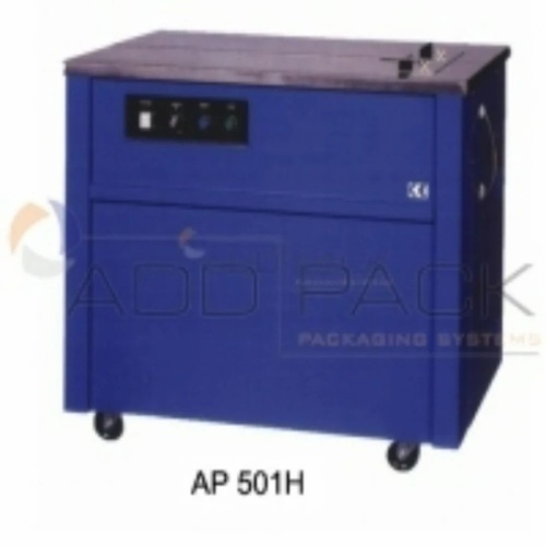 Cast iron tabletop strapping machine with 450N strap force, 13mm strap width, and 1.5-second strapping speed. Features 750mm table height.