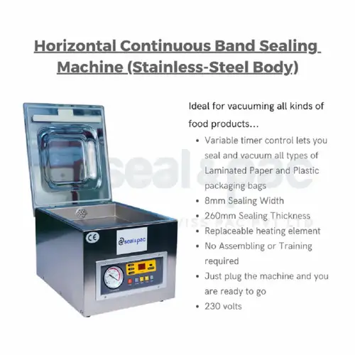 Automatic tabletop vacuum chamber machine with 1050W power, 230V voltage, and 5 pieces/minute capacity. Features 260mm sealing length and 8mm width. Dimensions: 320x410x320mm.