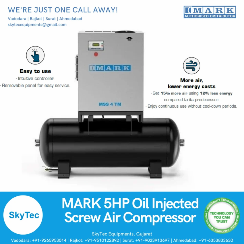 New, color-coated, tank-mounted screw compressor made in India. Weight varies by size. Suitable for industrial use.