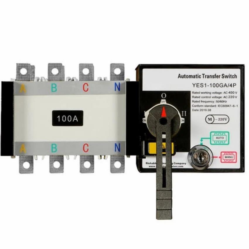 Tata Rishabh Automatic Transfer Switch Panel. Rated 100A, 400VAC, 220VAC control voltage, 50/60 Hz, Three Phase, High-Voltage operation.