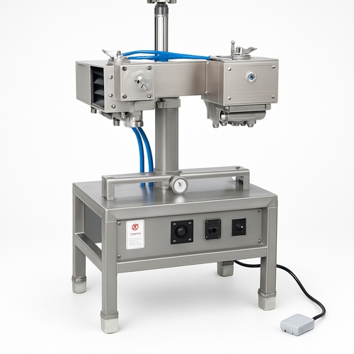 Semi-automatic tube sealing machine for compound tubes. Operates vertically with 220V power supply, producing 600-700 tubes per hour. Weighs 60 Kg and measures 26 x 18 x 40 inches.