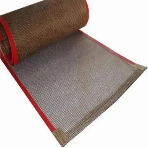 Heat-resistant conveyor belt for dryers, heat tunnels, UV curing, glass printing, and shrink wrap machines. Features low elongation and custom lengths/thicknesses. Minimum order 1 sqm. Made in India.