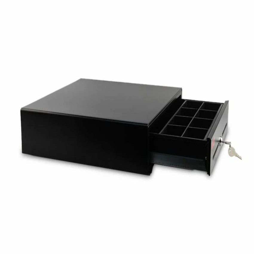 Thermal cash drawer, RETSOL RSK 410, for commercial use. Features joint 5 bill/5 coin trays, 4-position lock, RJ12 compatibility. Dimensions 410x415x100mm, 7.5kg.