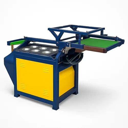 Semi-automatic thermocol plate machine, 12-inch max plate size. Features 1 HP motor, single phase, 4mm sheet thickness. Produces 60 plates per minute.