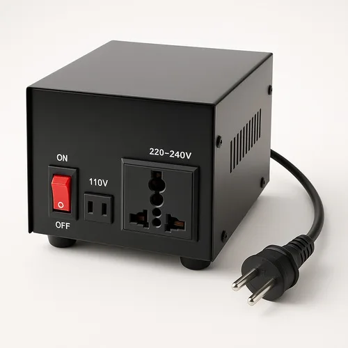 This three-phase step-down transformer offers 2000 W power, with a 220-240V input and 110V output. Features an on/off switch and includes 2 spare fuses.