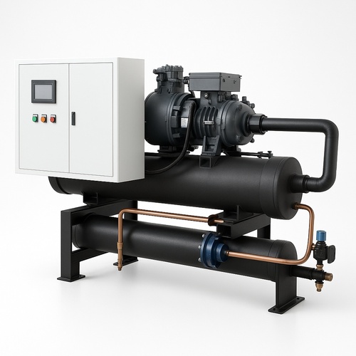 Three phase, 50 ton evaporative condenser chiller (IC-3i-23126) with 415v power, mild steel casing/coil tubes, and SCROLL compressor. Water cooled type.