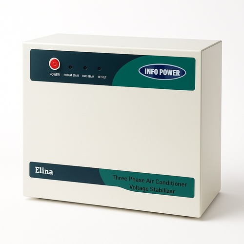 A 5 kW three phase automatic voltage stabilizer with wall mounting capability. Operates on 240-270V input, providing stable power for three phase air conditioning systems.