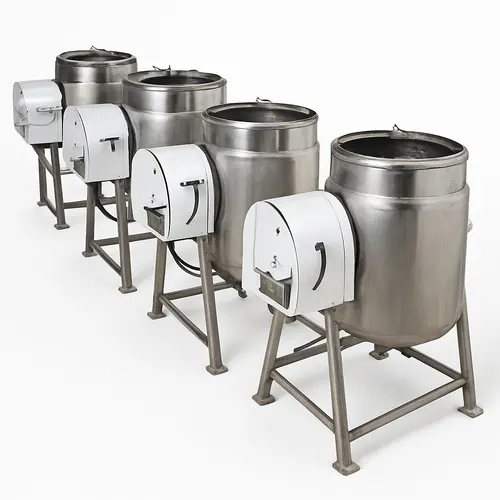 Bulk rice cooking vessel, 500-2000 L capacity. Stainless steel construction with matte finishing. 1500 Watt power, 415 V.