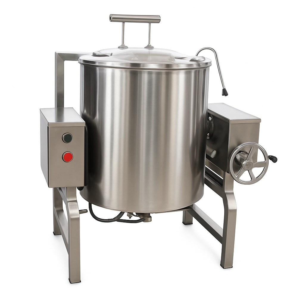 Tilting bulk cooker machine designed for high-volume food preparation. Features a durable construction for commercial environments. Efficient and reliable operation.