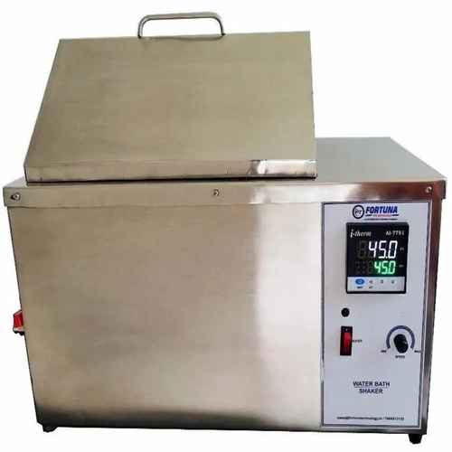 Water bath shaker with timed operation, 50 Hz frequency, 500 W power, and temperature range up to 98°C. Includes 1-year warranty. Made in India.