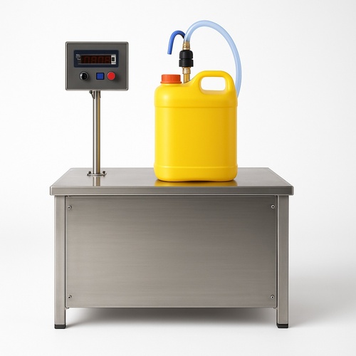 Semi-automatic SS 304/316 edible oil tin filling machine. Features load cell based voltage, 15-liter capacity, driven type, and dual automation grade.