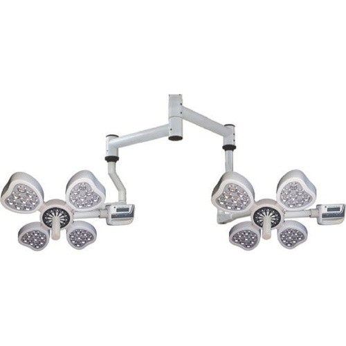 Quad dome, ceiling-mounted LED OT light for operation theaters. Features angular movement, remote control, and height adjustment up to 6 feet.
