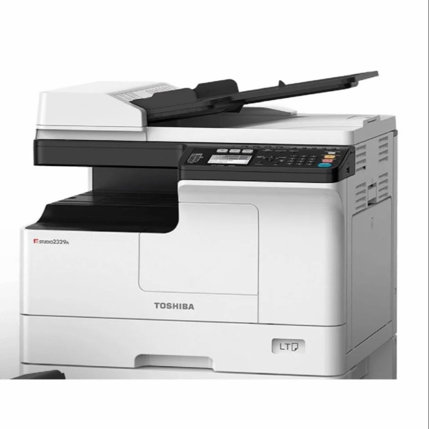 Toshiba 2329A laserjet machine. Features black & white output, USB & RJ45 connectivity, 1 tray, A3 paper size, and 15-second warm-up time.
