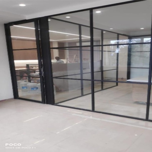 Clear, plain toughened glass partitions for offices. Offers acoustic and thermal insulation. Features a modern black matt finish frame.