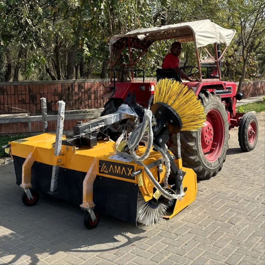 Tractor mounted road broomer with 2000 mm roller width. Features 200 L dust hopper capacity, 10000 m.sq/hr coverage, and hydraulic oil fuel type. Yellow standard colour.